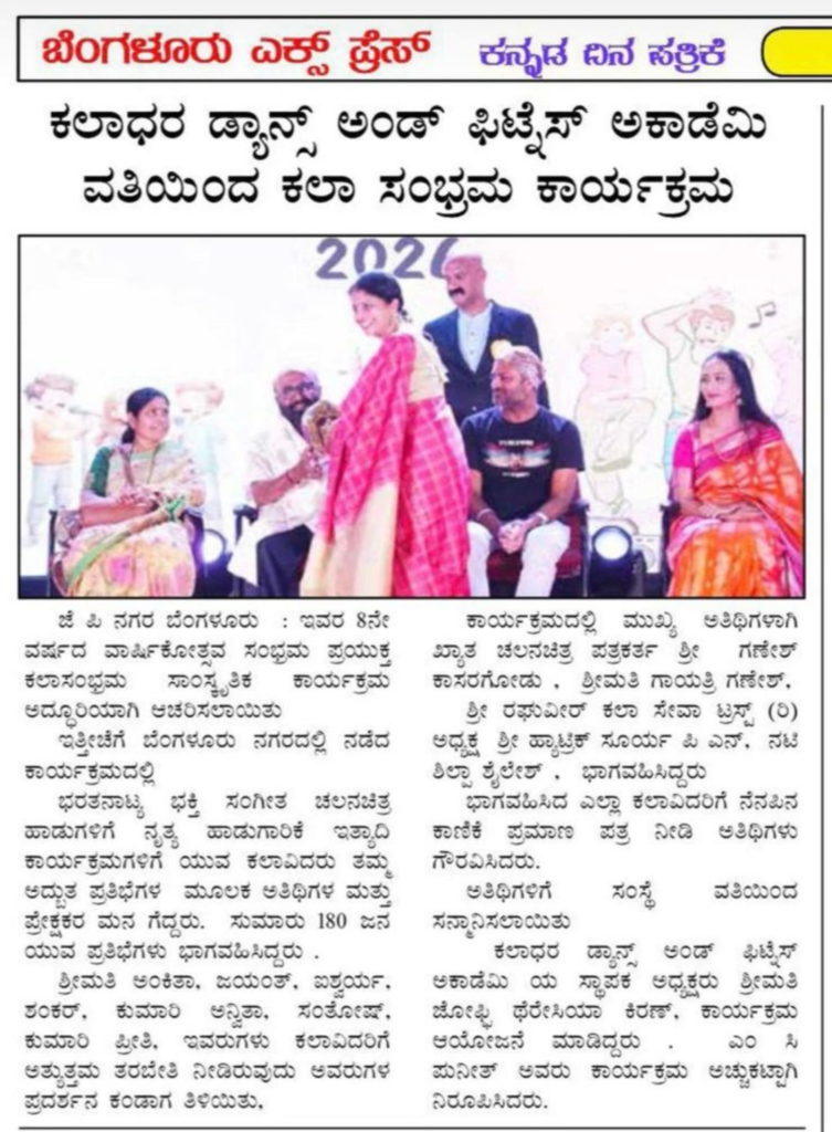 The academy’s founder, Guru Jophy Theresia Kiran, was honored for her outstanding contribution to arts and culture as Kalandhara Dance & Fitness Academy presented a spectacular cultural program. Featured in prominent Kannada press, the event highlighted vibrant performances by students and recognized her dedication to nurturing talent in dance, music, and fitness across Bengaluru.